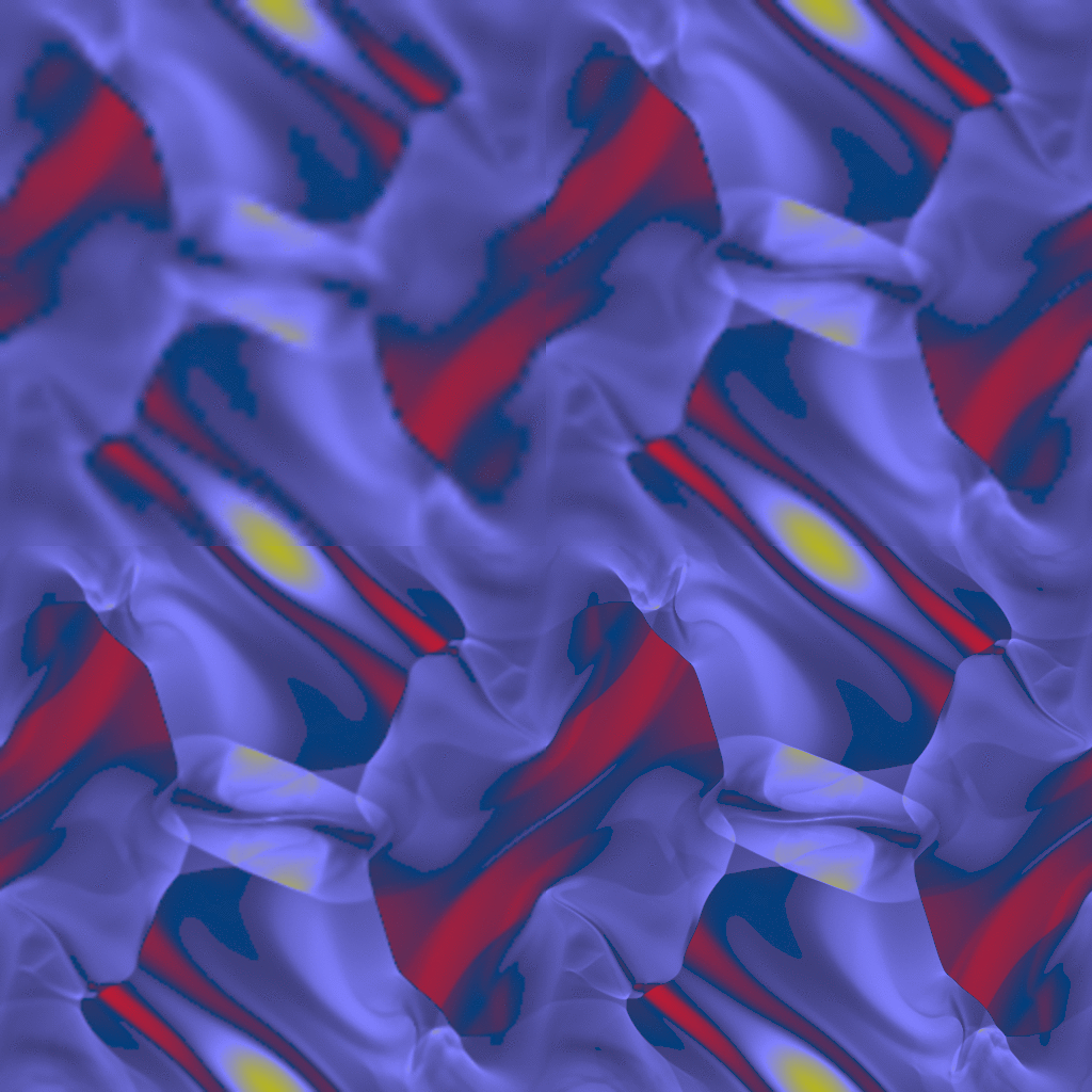 The results for time=0.5 are shown below for a 64x64 grid (upper left), 128x128 grid (upper right), 256x256 grid (lower left), and 512x512 grid (lower right). The images show the density on a linear color map. (Note the image below contains all four results joined into one 1024x1024 image.)
