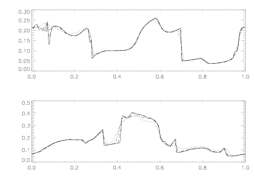 They can be compared to Figure 11 of Londrillo & Del Zanna (2000) and Figure 3 of Ryu et al. (1998) (taken at time=0.48) (see also Jiang & Wu 1999).