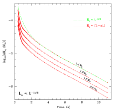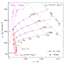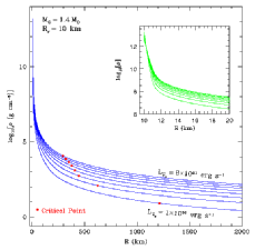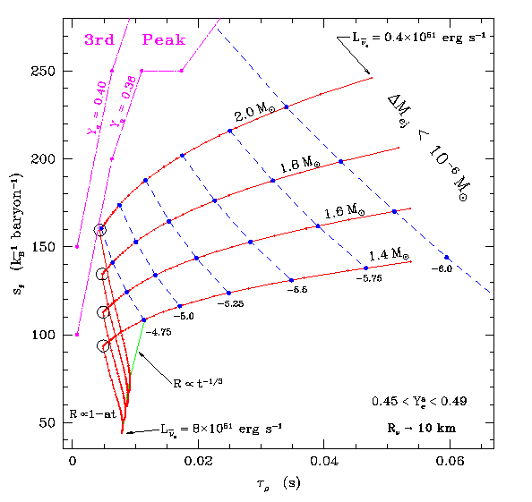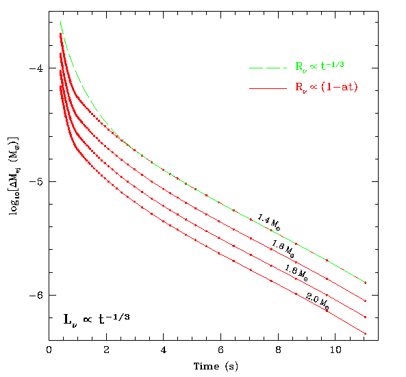 Also of critical importance is the mass ejected in the wind. The solution to the time-independent wind equations consititutes an eigenvalue problem for the mass outflow rate, which must be constant as a function of radius. Using our steady-state wind solutions and an ansatz for the time evolution of the neutrino luminosity, we can construct the evolution of the wind in its first 5-10 seconds. As the luminosity decays, the entropy, timescale, and elctron fraction evolve. At each point in 'time' (luminosity) we can ask if the wind has entered a regime in the space of entropy and dynamical timescale where the r-process is likely to occur. We can then estimated the integrated mass loss. Note: of key importance is the fact that if supernovae account for all r-process elements in the galaxy, then only approximately 10^{-6} solar masses of material can be ejected in each supernova event. |