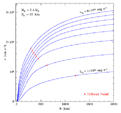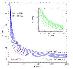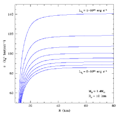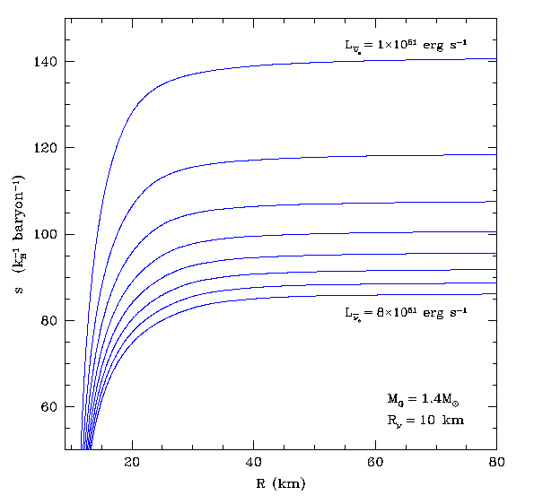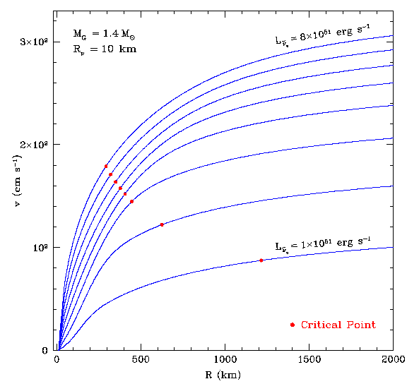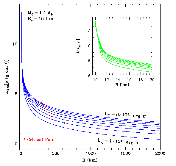 Although the wind is interesting in its own right, hydrodynamically and as a phenomenon that attends both the supernova and the cooling phase, perhaps its most important ramification is the potential production of approximately 50% of all the nuclides above the iron group in rapid(r) neutron-capture nucleosynthesis. Below we show a collection of figures from our work on steady-state protoneutron star winds. |