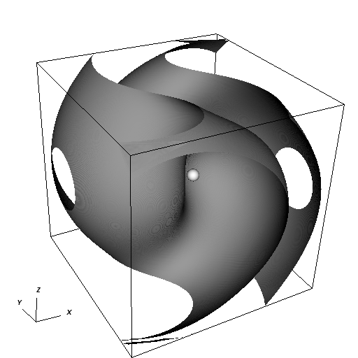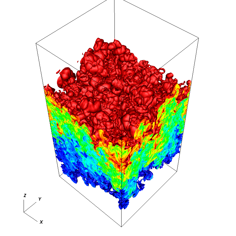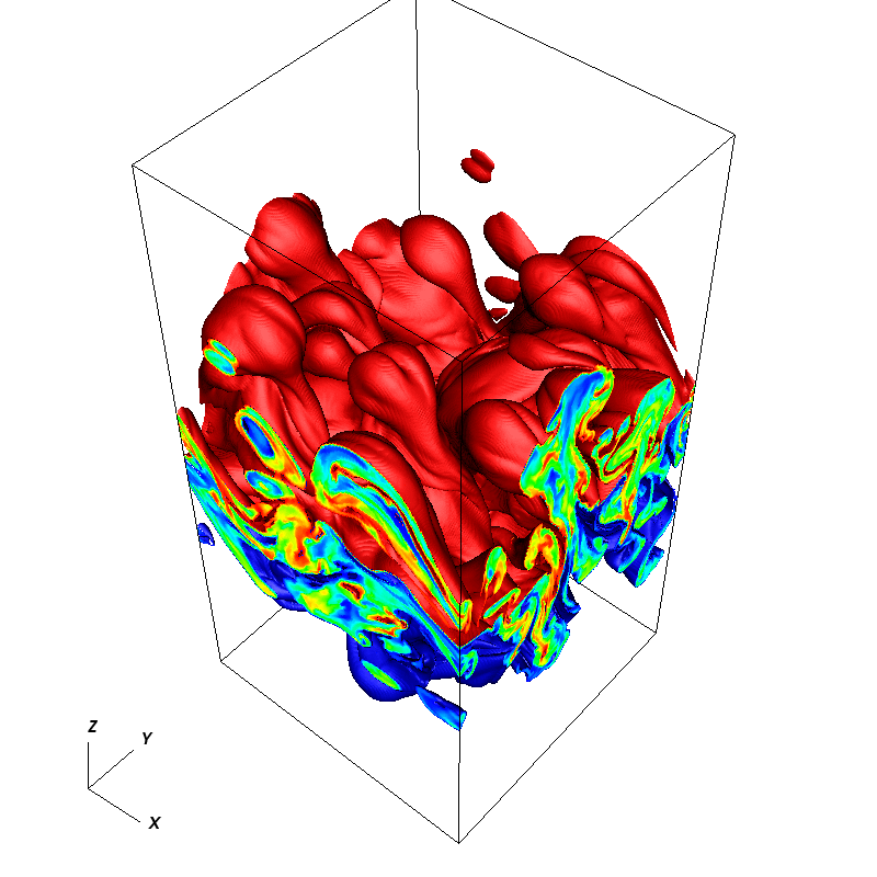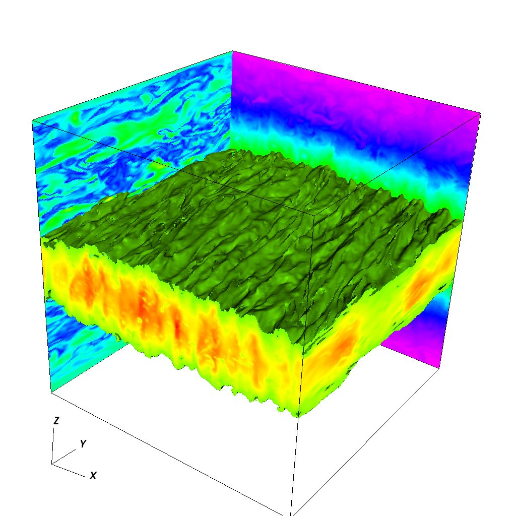 Sustained Magnetorotational Turbulence in Local Simulations of Stratified Disks with Zero Net Magnetic Flux by S. Davis, J. Stone, & M. Pessah, ApJ 713, 52 (2010). Isosurface (at d=0.75) and slices of the density at 250 orbits in a domain of size 4H X 4H X 4H during the evolution of the magnetorotational instability in a vertically stratified disk. On the left face of the domain a slice of the magnitude of the magnetic field is shown. |