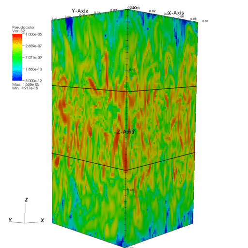 Nonlinear Evolution of the Magnetothermal Instability in Two Dimensions by I. Parrish & J. Stone, ApJ 633, 334 (2005). Saturation of the Magnetothermal Instability in Three Dimensions by I. Parrish & J. Stone, ApJ 664, 135 (2007). Magnetic energy density along the faces of the computational volume in a three-dimensional simulation of the MTI in a plane-parallel stratified atmosphere. Magnetic field amplification by vertical convective motion is clearly evident. The MTI is driven by anisotropic conduction along magnetic field lines in a weakly collisional plasma, destabilizing atmospheres with entropy profiles that are stably-stratified in the abscence of conduction. |