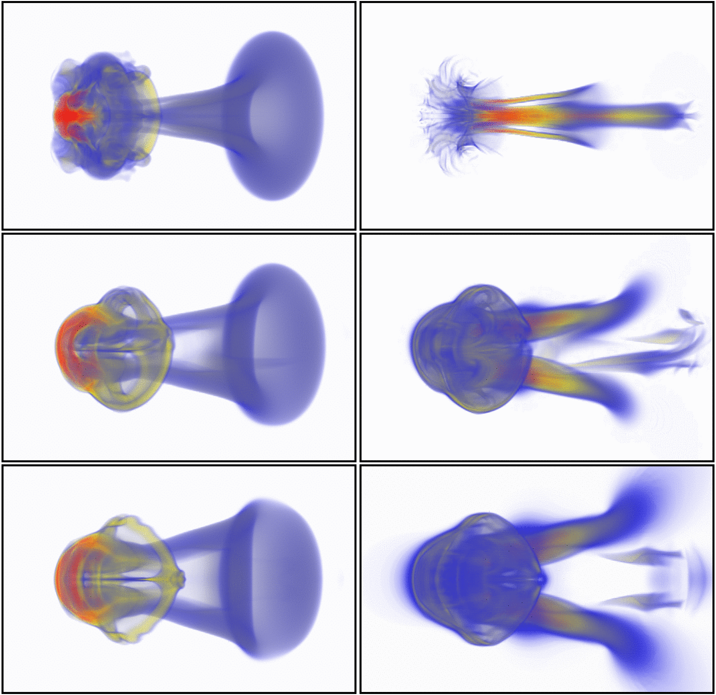Buoyant Bubbles in Intracluster Gas: Effects of Magnetic Fields and Anisotropic Viscosity by R. Dong & J. Stone, ApJ 704, 1309 (2009). Slices of the density in the x-y plane (left half of each plot) and y-z plane (right half of each plot) at t=1 (left column), t=4 (middle column) and t=8 (right column) during the buoyant rise of a low density bubble in a spherically-symmetric atmosphere with an initially horizontal magnetic field, and anisotropic viscosity relevant to low density plasmas. The top row shows the evolution of run with a weak field, the middle an intermediate strength field, and the bottom row a strong field. A linear color scale from d=0 to d=1 is used. |