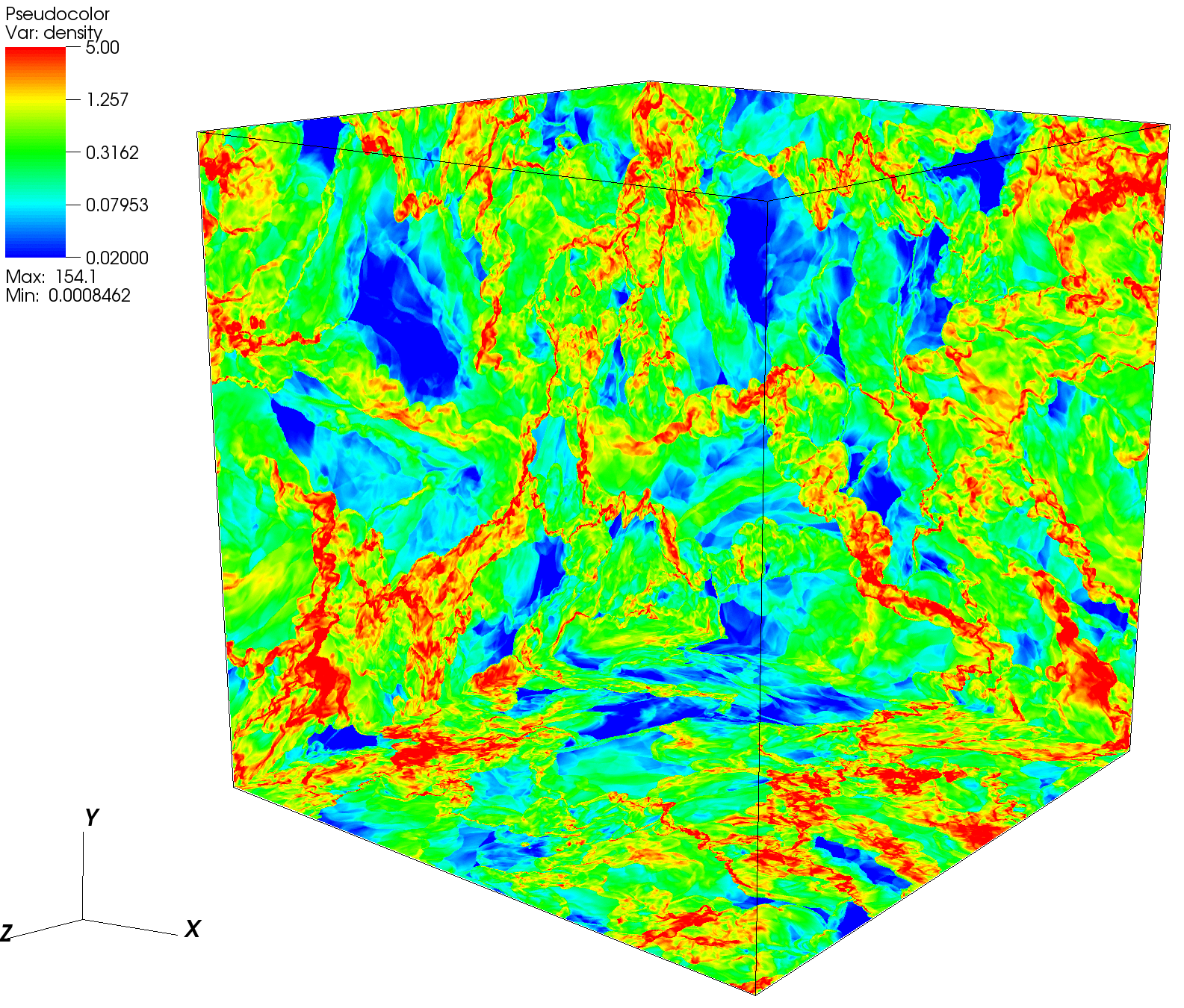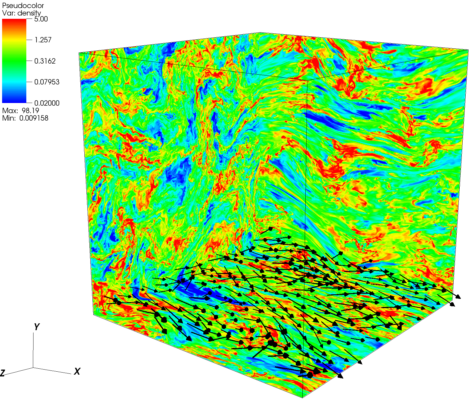 Density Probability Distribution Functions in Supersonic Hydrodynamic and MHD Turbulence by N. Lemaster & J. Stone, ApJ 682, L97 (2008). Dissipation and Heating in Supersonic Hydrodynamic and MHD Turbulence by N. Lemaster & J. Stone, ApJ 691, 1092 (2009). Logarithm of the density (colors) on three faces of the computational volume and representative magnetic field lines (arrows) from both strong field MHD (top) and hydrodynamic (bottom) supersonic turbulence computed at a resolution of 1024^3. The sonic Mach number is about 10 in both cases, whereas the Alfvenic Mach number is 0.5 for the strong field MHD case. There are significant differences in the statistics of the density between the cases, evident from the images. Click on the images to download higher resolution versions. |