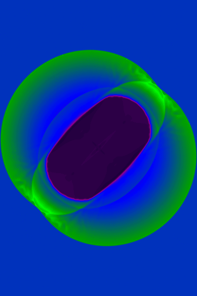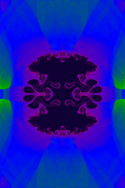 Note the pattern of dense fingers in the interior produced by the Richtmyer-Meshkov instability is exactly symmetric.