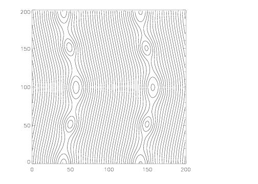 Although we do not know the analytic solution for this problem, we have found it to be an excellent test of the robustness of the algorithm. For ideal MHD, initially the solution should be nonlinear linearly polarized Alfven waves propagating along the field in the y-direction (which quickly generate magnetosonic waves since the magnetic pressure does not remain constant). However, because of the two current sheets in the problem (at x = ±0.25), reconnection inevitably occurs. Because β < 1, this reconnection drives strong over-pressurized regions that launch magnetosonic waves transverse to the field. Moreover, as reconnection changes the topology of the field lines, magnetic islands will form, grow, and merge. The point of the test is to make sure the algorithm can follow this evolution for as long as possible without crashing. Keeping ∇⋅B = 0 as the field toplogy undergoes complex changes could be important.