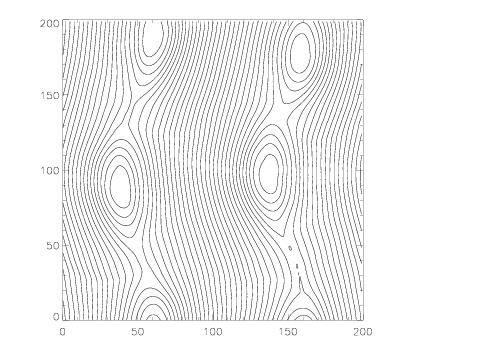 You can also downlad a movie of By (46 MB). The production of magnetosonic waves due to the dissipation of magnetic energy in the reconnection regions is clearly visible in the movie. Note that code that use an internal (rather than total) energy formulation (like ZEUS) do not produce such strong transverse waves.