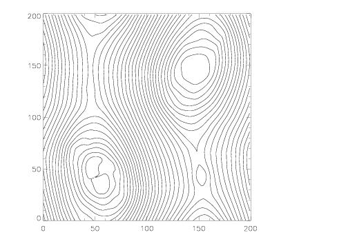 The plots below show the magnetic field lines at times of 2, 5, and 10 computed using a 100 x 100 grid using the Roe solver and the third order algorithm. We choose β = 0.1 and A = 0.1. The emergence and merging of magnetic islands is clearly visible.