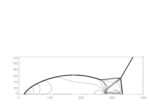 Results computed with Athena using the Roe solver on a 390x120 grid (Δ x = Δ y = 1/120) are shown below. Contour plots of the density at the final time t = 0.2 are shown using 30 levels. No artificial viscosity, flatteners, or extra diffusion of any kind was used.