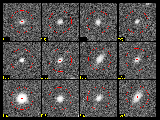 Once a sample of 'good' objects for a given frame is formed, the best-fit pre-calculated model is determined from their mean profile. This profile is also used to calculate several photometric corrections (e.g. the aperture correction used to convert psfCounts to the counts within some aperture, currently aperture 3, with radius 4.41 pixels XXX).