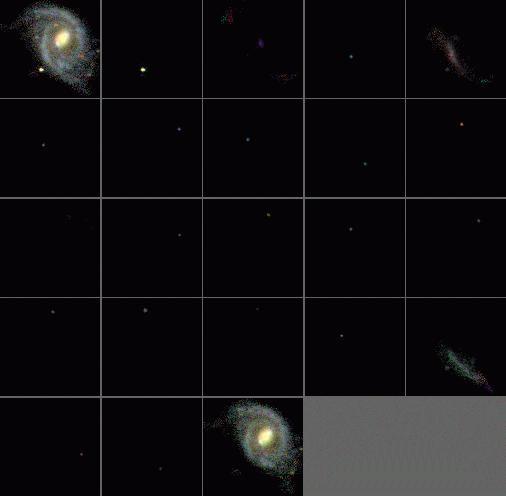 The v5_3 deblend of the same system. All children have `astrophysical' colours (the removal of a part of the lower-left corner of the galaxy into a separate child is a result of this galaxy touching the edge of the chip).