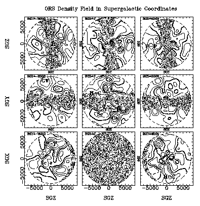 (Figure: contour map of the density field of ORS galaxies in 9 slices